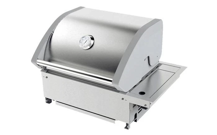 - 304SS with die cast end caps. Double skinned hood. Front pull out drain tray. High hood – cook with the lid up or down. Grill, oven or rotisserie.
