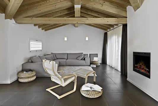 The 26″ plug-in electric firebox includes built-in thermostat, on/off flame control and separate controls for flame speed, interior brightness and heater.