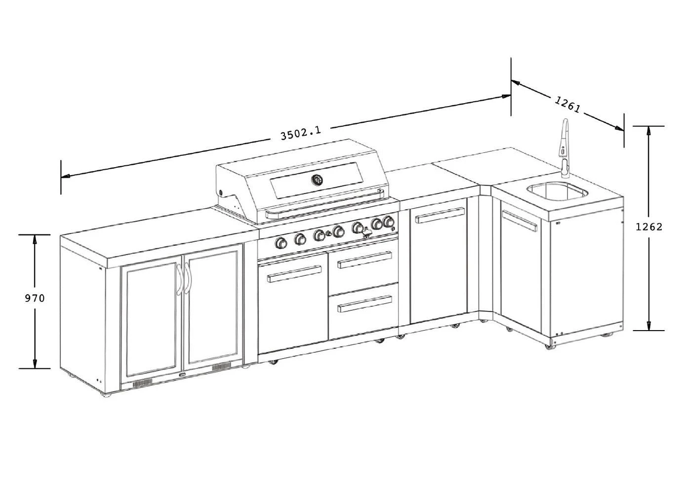 Its powerful 6 burner barbecue Island Module has everything you need to prepare the best recipes, food and impress your friends. Fitted with storage compartments, a sink, tap, a corner cupboard, and bar fridge module to chill drinks. With this modern outdoor kitchen setup, you are sure to impress and entertain your family and friends.