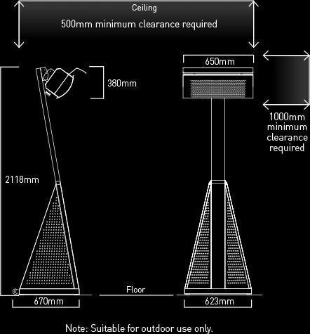 For the standard heat reflector supplied with the heater, a 500mm overhead clearance is required. For low clearance mounting, please use the optional Heatshield (TGHAC-003) to allow a 300mm overhead clearance.