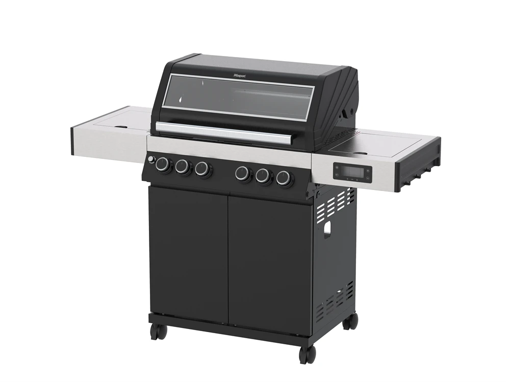 The MB5000 provides a sleek powder coat finish in Black or White with a rollback double lined hood, 4 stainless steel burners with an additional rear burner and side burner, stainless steel flame tamers and electronic temperature gauge with meat probes. There is plenty of cooking options with this 4 burner barbecue that will keep the chef in all of us entertained.