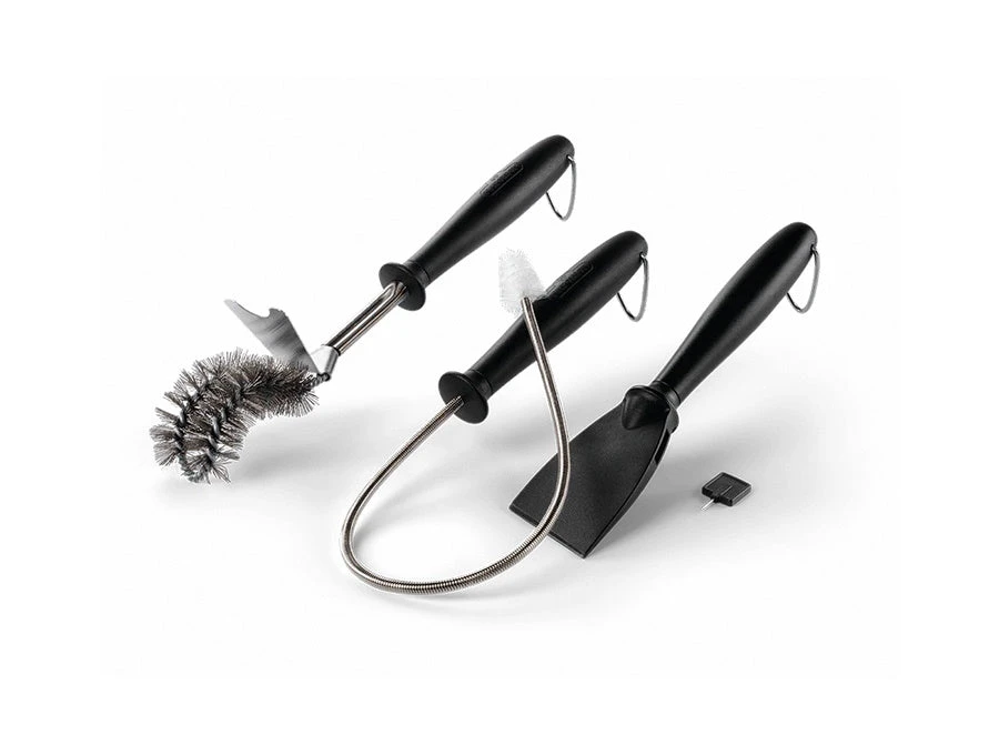 Set includes an angled cooking grid cleaning brush with a grid scraper, a venturi tube cleaning brush, a firebox scraper that won’t damage the steel, and a burner port cleaner that is stored in the firebox scraper.