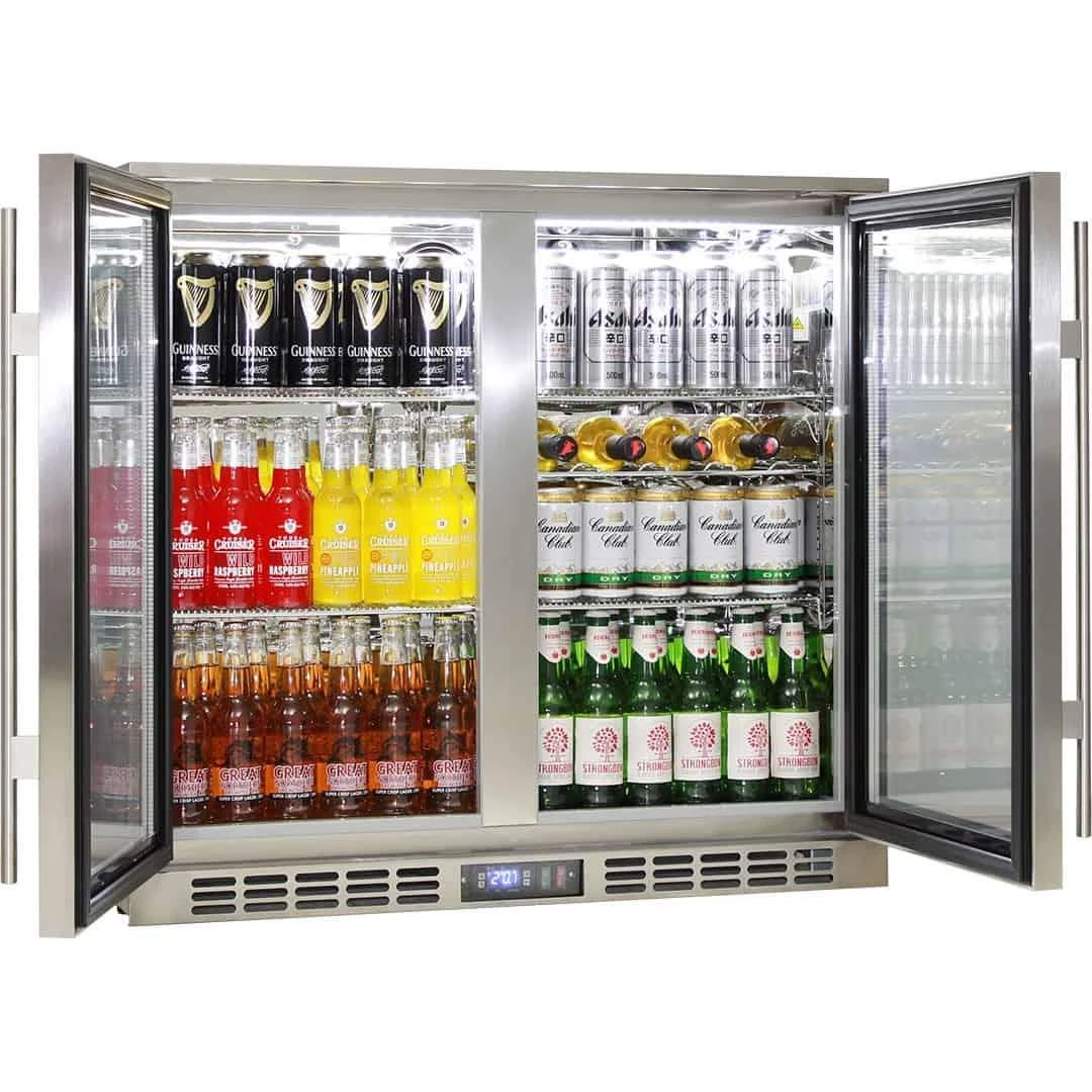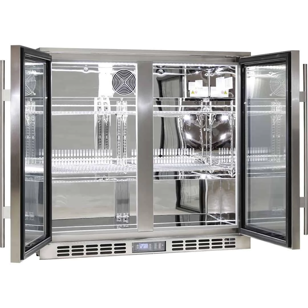Rhino all stainless 2 door heated glass door bar fridge, with brand name parts and designed by the best engineers, built by a quality long term manufacturer, to bring a reliable product to the market. The ‘seamless’ stainless steel door is a new feature that is now very popular. Features include LG compressor, heated glass, lock, self-closing doors, HD shelves, and polished stainless steel interior to make unit robust for tough conditions.