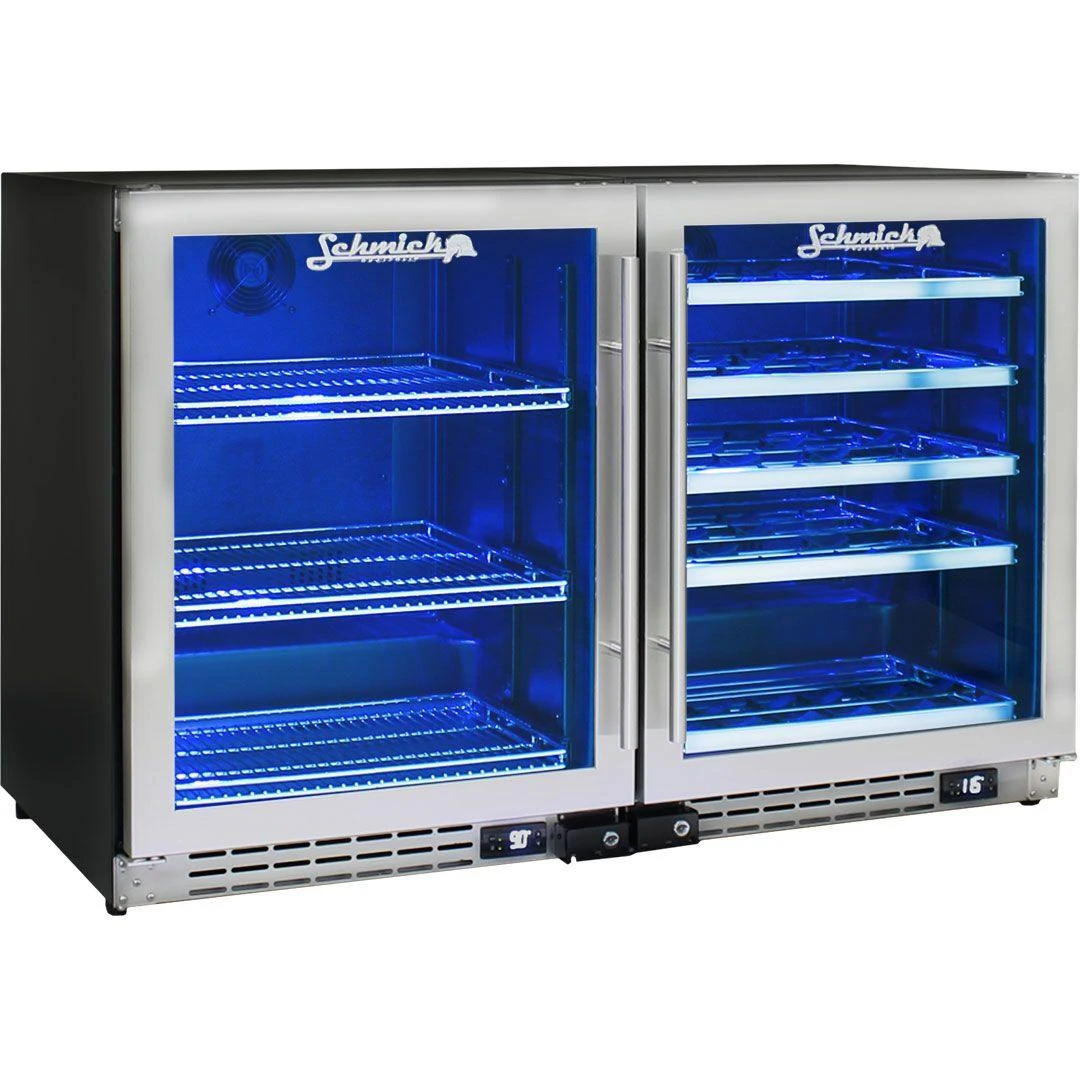 Glassdoor under bench front venting beer and wine combination fridges with triple glazed LOW E glass, quiet fans, and German electronic controller. Wine shelving is a unique patented rubber saddle type that allows all size bottles to fit on one shelf.