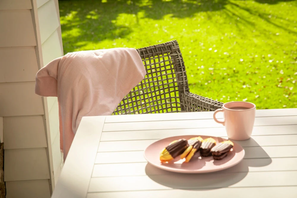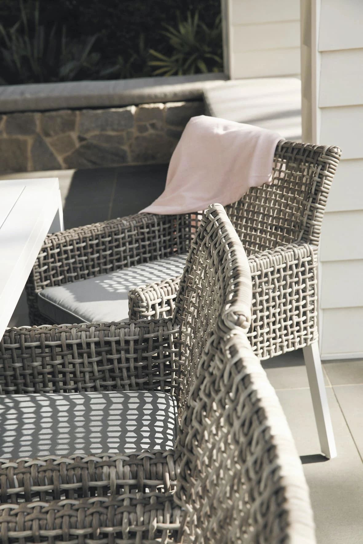The exquisite dining chairs from Shelta feature a blend of aluminium legs and a spacious woven wicker tub atop that includes a cozy seat cushion for additional comfort. These chairs come with a choice of two different wicker options and are adorned with O’bravia ‘Boulder’ fabric.