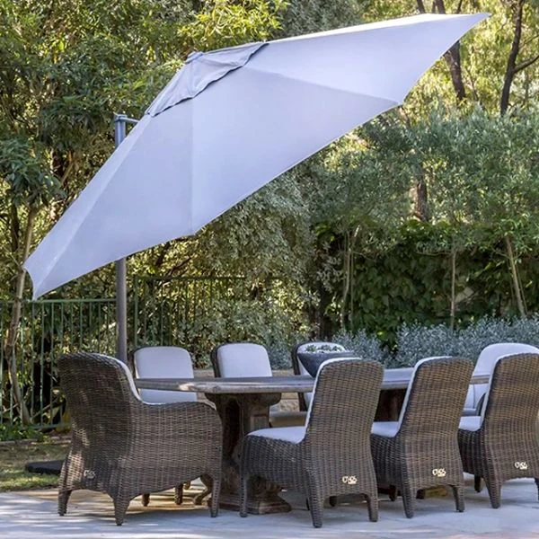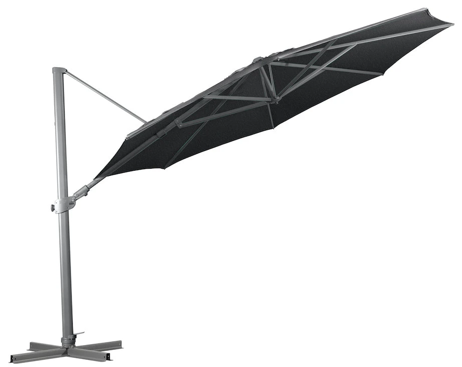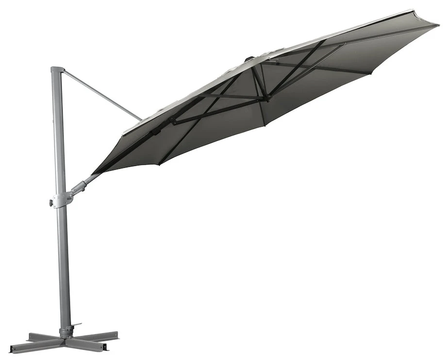 Regis is Shelta’s important mid-size / mid-price Cantilever. It uniquely features side axis winder handle controlled tilt – to 75˚ to either side; as well as normal mast axis tilt. Regis has all other Shelta Cantilever attributes – winder handle opening and closing, 360˚ rotation around the mast (to give shade where needed), LED light mount and compatibility with Shelta’s Large and Extra Large wheeled resin bases. Includes Polyester Protective Cover.