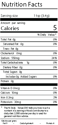 Ingredients: Sea salt, black pepper, garlic, onion, paprika, and spices. NO MSG, Gluten-Free.